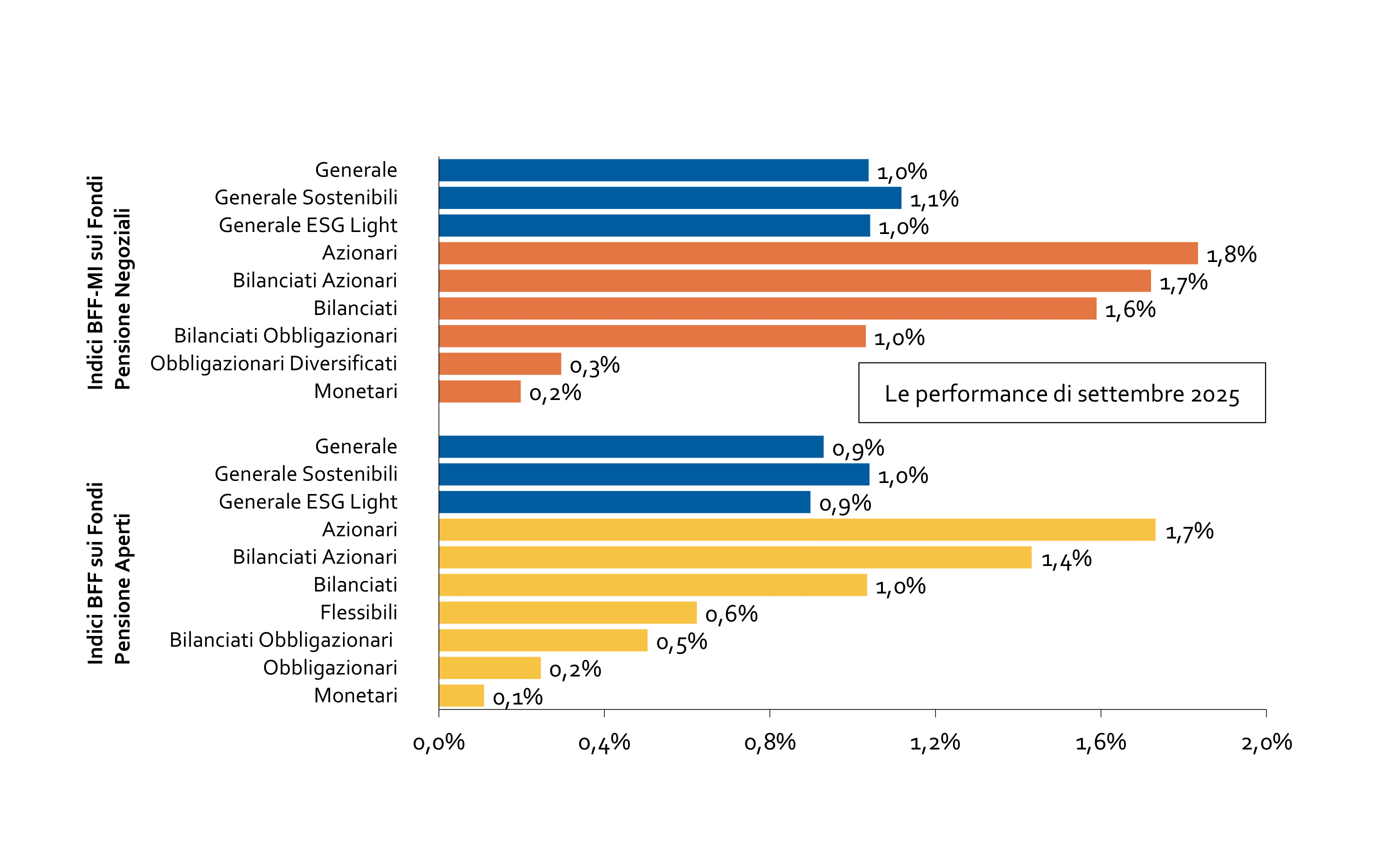 La condotta più espansiva della Federal Reserve ha dato impulso ai Fondi Pensione a settembre, spingendo in deciso rialzo i comparti a maggior contenuto azionario. I Negoziali (FPN) si sono apprezzati dell’1,0% e gli Aperti (FPA) dello 0,9% (in base, rispettivamente, agli Indici Generali BFF-MI sui FPN e BFF sui FPA), trainati dalle performance decisamente positive delle linee Azionarie (+1,8% i FPN e +1,7% i FPA) e Bilanciate Azionarie (+1,7% i FPN e +1,4% i FPA). I comparti obbligazionari, invece, nonostante il buon andamento dei Treasury, sono stati frenati dalle numerose dichiarazioni di esponenti della BCE a prevalente orientamento restrittivo, che hanno causato la salita dei rendimenti sulla parte breve e media delle curve europee.