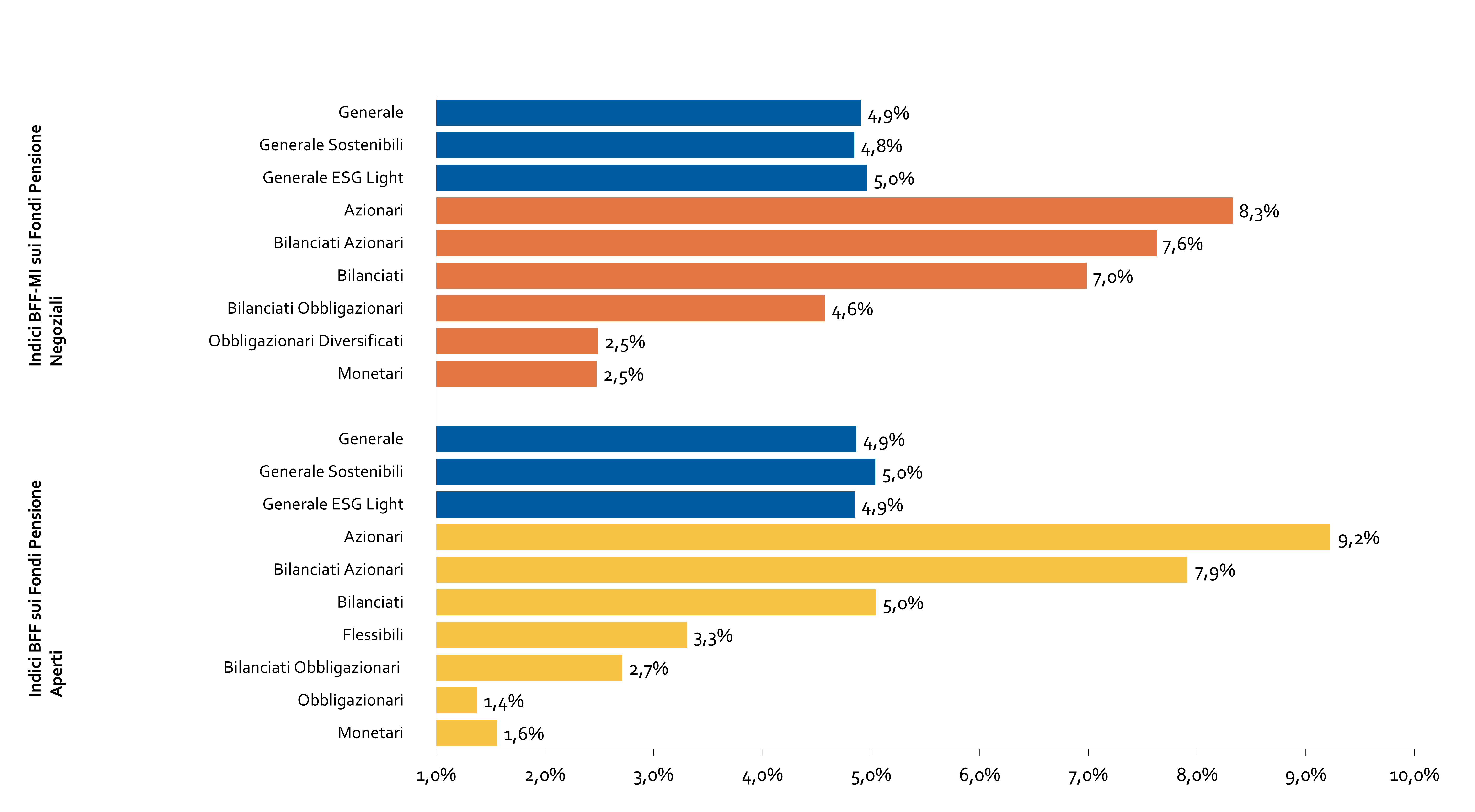 In particolare, i Fondi Pensione Negoziali (FPN) sono variati dello 0,1% (in base all’Indice BFF-MI Generale) e i Fondi Pensione Aperti dello 0,0% (in base all’indice BFF Generale), portando le performance annuali del 2021 rispettivamente al 4,7% e al 4,3%.