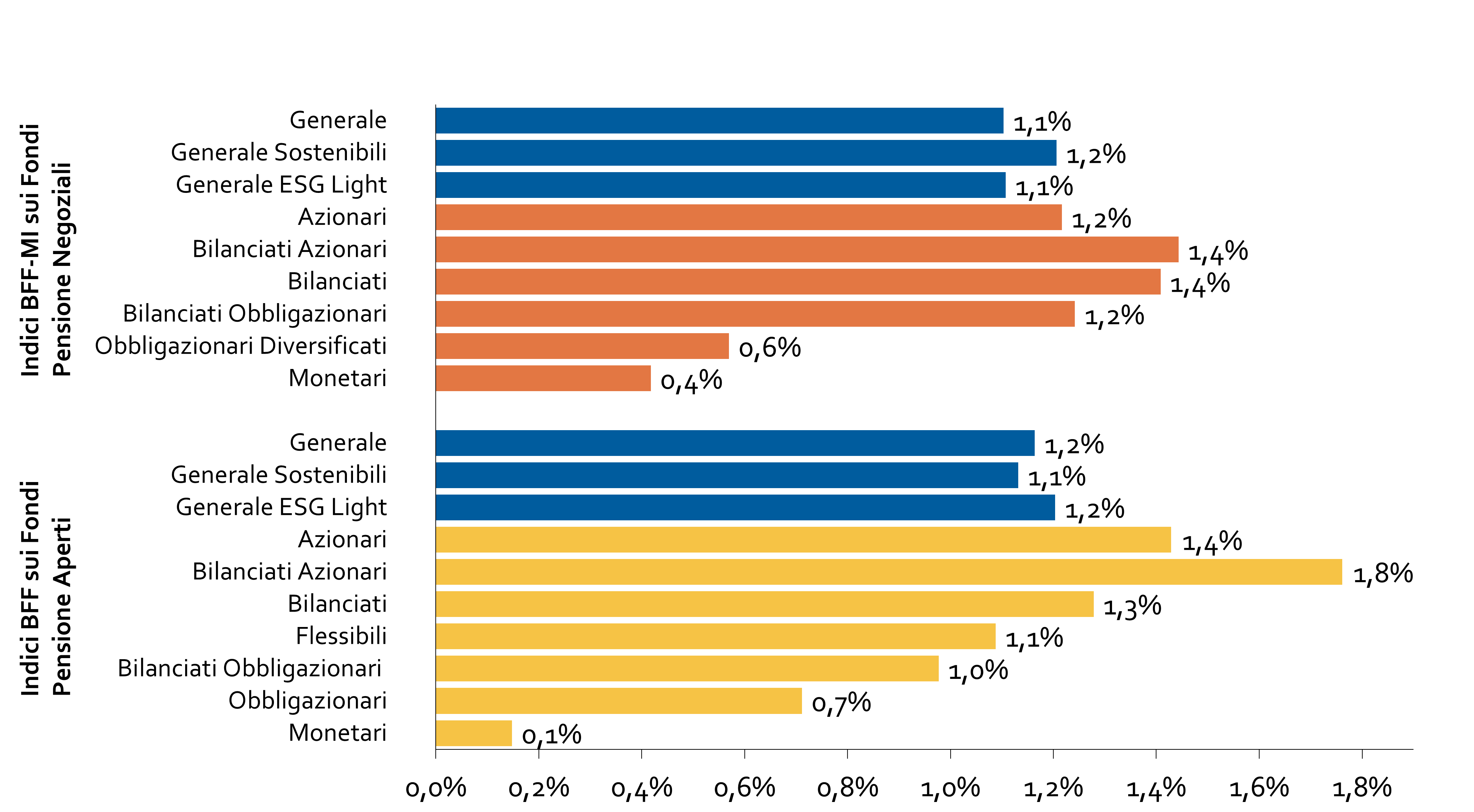 A febbraio, il netto apprezzamento dei mercati obbligazionari, causato dal diffuso calo dell'inflazione e dal rallentamento dell'economia USA, ha trainato in deciso rialzo i Fondi Pensione. I Negoziali (FPN) si sono apprezzati dell’1,1% e quelli Aperti (FPA) dell’1,2% – in base, rispettivamente, agli Indici Generali BFF-MI sui FPN e BFF sui FPA – con le performance migliori messe a segno dai comparti Bilanciati Azionari (+1,4% i FPN e +1,8% i FPA), dai FPN Bilanciati (+1,4%) e dai FPA Azionari (+1,4%).
